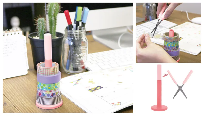 マスキングテープを使う時、デコレーションなど細かい作業をするのにはさみは必須。収納とはさみを一体化させることで、「マスキングテープを収納したままカット」ができるようになりました!