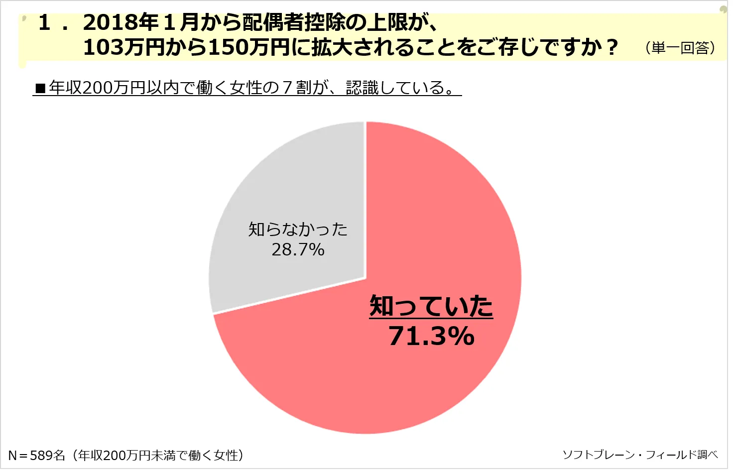 2018年1月から、配偶者控除の年収要件が現在の103万円から150万に変更されることについて、「知っていた」が71.3%で、「知らなかった」28.7%を大きく引き離し、関心の高さが伺える結果になった。