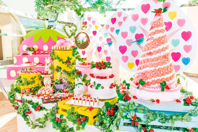 苺畑をテーマにしたブッフェ台で一際目を引くのは、1メートル20センチ四方の巨大ストロベリーシェルフ。つぶつぶ苺を表現したデザインには、よく見るとラビット模様が隠されています。ハートの実がなる幸せの木々に集まるのは、春の訪れを祝福するカラフルな小鳥たち。