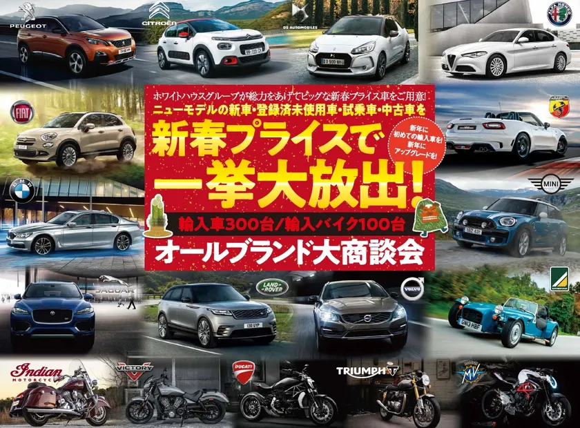 輸入車・自動車関連用品販売の株式会社ホワイトハウス(本社:名古屋市、代表取締役:木村 文夫)は、当社が運営する日本最大規模の輸入車正規販売ディーラーの屋内展示場「オートプラネット名古屋」にて、毎年恒例の新春イベント「ALL BRAND NEW YEAR SALE」を2018年1月6日(土)・7日(日)の2日間開催いたします。