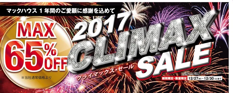 今年も残すところ、あとわずか。マックハウスでは1年間のご愛顧に感謝を込めて「2017クライマックス・セール」を開催いたします。
