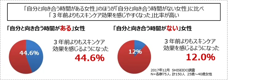 25歳~40歳の女性150人を対象に行った調査によると、「自分と向き合う時間がある女性」は「自分と向き合う時間がない女性」と比べ「3年前よりもスキンケア化粧品の効果を感じやすくなる」という傾向があり、「自分感度」が高い人ほどスキンケア効果を感じやすくなる=“肌感度”が高くなることがわかりました。