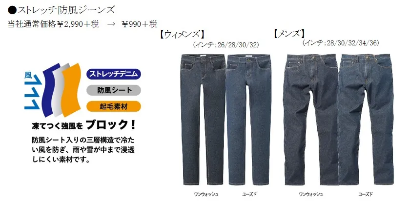 おすすめのボトムスは、凍てつく強風をブロックする『ストレッチ防風ジーンズ』。暖かさはもちろん、ストレッチ機能にもこだわり、はき心地も抜群。三層構造で表のストレッチデニム素材と裏の柔らかく暖かい起毛素材の間に、防風シートをプラスし冷たい風を防ぎます。また、雨や雪が中まで浸透しにくくなっており、このボトム一本で暖かさを確保できます。