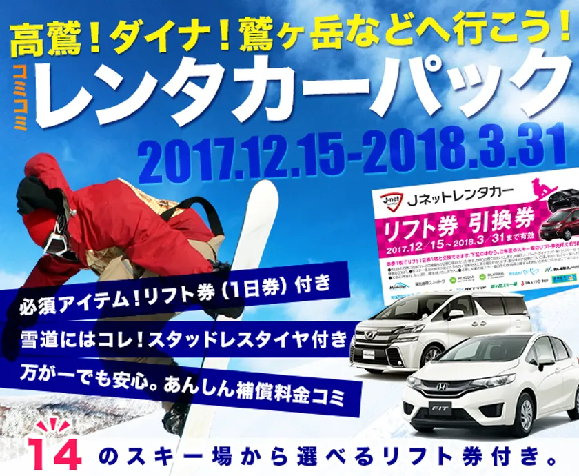 J-netレンタリース株式会社(本社:愛知県名古屋市中区、代表取締役社長:對馬 正幸)は、全国14のスキー場から選べる1日リフト券付きレンタカーパックを、Jネットレンタカーにて2017年12月15日に販売開始しました。