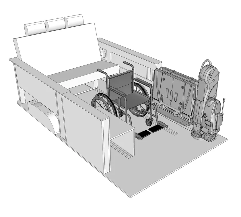 「運転席、助手席の真後ろに車椅子を固定したい」という声をもとに、現在の後方バックドアからのアクセスを、新型は左側スライドドアからリフトで車椅子が車内にアクセスでき、通常のセカンドシート位置に固定、右サイドには補助席を装備するという仕様を新開発。これにより、重度の障害者が2名乗車ならびに3名乗車の際も、運転者、障害者共に不安を感じなく車での移動が可能となります。