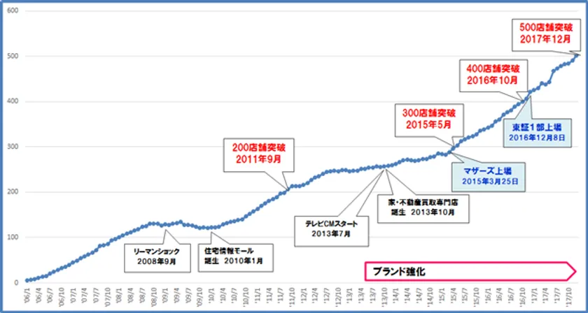 当社は1991年4月に京都府向日市で創業以来、新旧のFC加盟店舗の新陳代謝の影響で、一時的に加盟契約数が停滞した時期もありましたが、元 東京ヤクルトスワローズ選手兼監督の古田 敦也氏をイメージキャラクターに起用したブランド戦略や、2015年の東証マザーズへの上場および2016年の東証一部上場などが功を奏し、店舗数が右肩上がりで増え続けています。(下図参照)