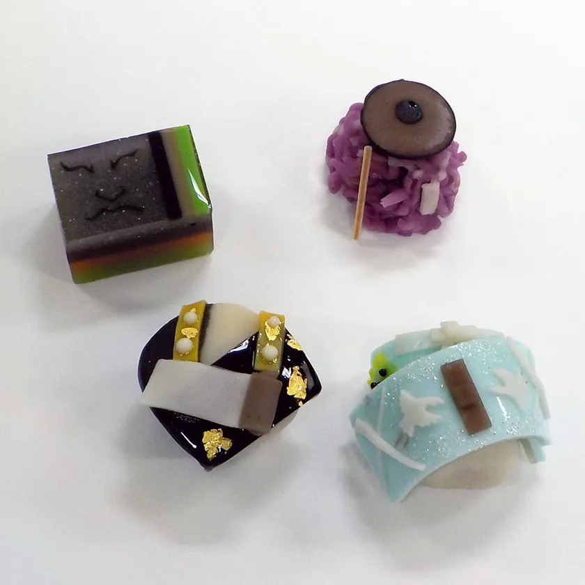 煉切にて中綿餡を包餡して三味胴(しゃみどう)型を作った土台へ、着物に見立てた黒羊羹と白羊羹を張り合わせております。