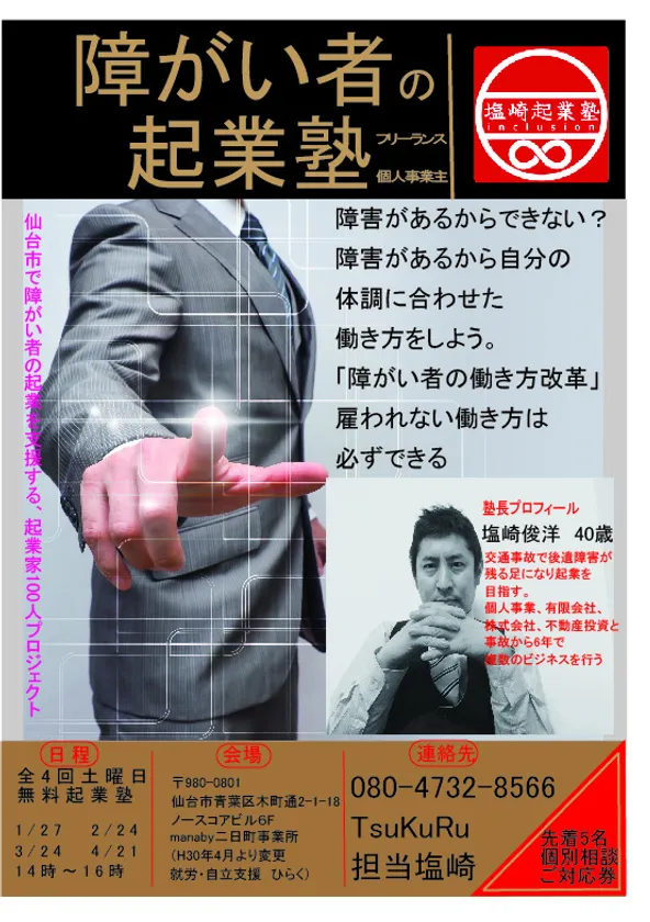 就労移行支援を行う株式会社 good conviction(代表取締役:塩崎 俊洋、所在地:宮城県仙台市)は、雇われずに「働く」障がい者が会社に合わせて働くのではなく、自分の障害に合わせた仕事を作ることを目標に“障がい者の起業を支援する”「起業家100人プロジェクト」を立ち上げました。その一環として、無料セミナー「塩崎起業塾」をmanaby二日町事業所(仙台市青葉区)で、2018年1月~4月に全4回開講いたします。