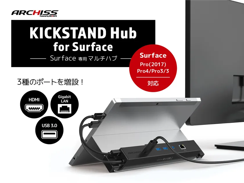 PC周辺機器などの卸、輸出入、販売代理店をおこなっている、株式会社アーキサイト(本社:東京都台東区、代表取締役:林 庫次郎)は、Surface専用マルチハブ「KICKSTAND Hub for Surface」を1月中旬に発売いたします。