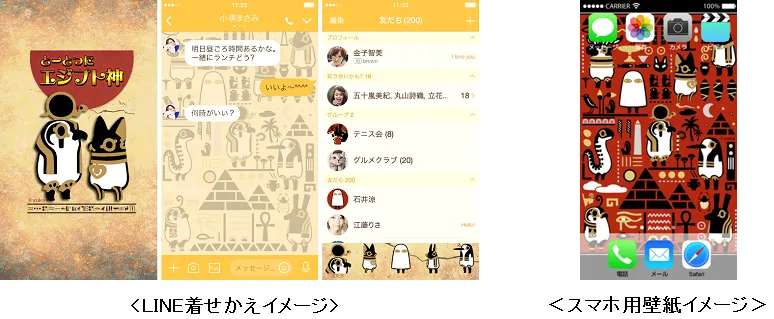 そしてこの度、数多くの商品化の要望の中でも特にリクエストが多かった「LINEスタンプ」及び「LINE着せかえ」の販売を開始いたしました。また同時に、ネオスが提供する着せかえプラットフォーム【カスタモ】や「ドコモメールストア」においても壁紙やスタンプなど、『とーとつにエジプト神』のシュールな世界観をお楽しみいただけるコンテンツを幅広く提供開始しております。