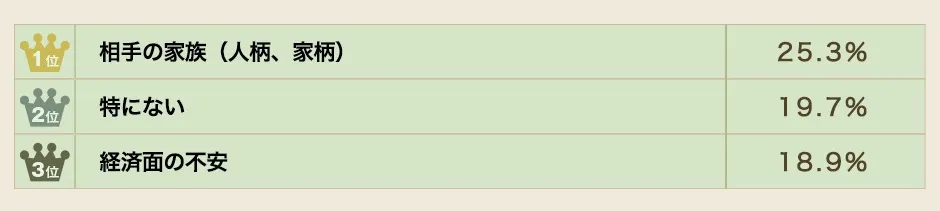 今回のアンケートは「経済面の不安」、「相手の家族(人柄、家柄)」、「相手の収入」、「子供が欲しいタイミング」、「結婚したいほど好きな相手か」、「その他」、「特にない」の7つの中から選んでいただきました。最初に、皆さんが一番に挙げた悩みからご紹介しましょう。