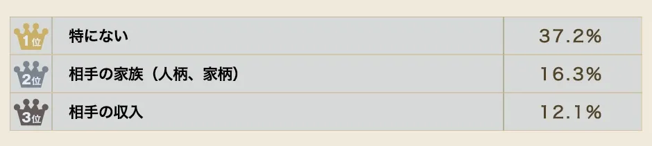 4位以下は、「特にない」(12.1%)、「その他」(6.1%)、「相手の収入」(5.3%)、「子供が欲しいタイミング」(2.8%)と続きました。