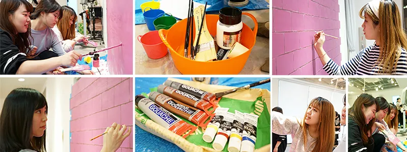 バンタンデザイン研究所 デザイン学科の学生が参加した当プロジェクト。「レイリー バイ ガーデン」認知拡大に寄与するべく、原宿という立地を活かして高校生~20代の女性をターゲットとしたデザインを目指しました。11月に開催されたプレゼンテーション会にてウォールアートデザインが決定、選考に受かったチームが施工を担当し12月25日(月)に完成しました。