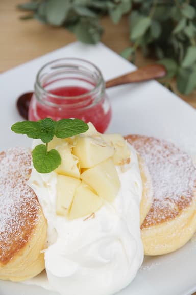 材料は、ベイキングパウダーを使わない無添加素材にこだわり、作り置きではなく一つ一つの仕込みを直前に行っています。また、従来のパンケーキでは数分程度で焼き上げるところを、『幸せのパンケーキ』では蒸し焼きにするなど20分間以上の工程をかける特殊な焼き方を採用しています。