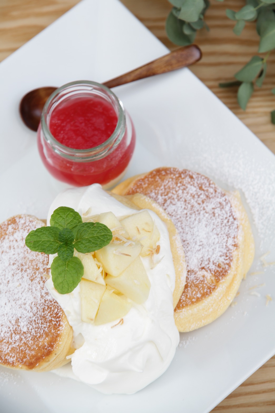 「国産りんご紅の夢とギリシャヨーグルトソースの、りんごパンケーキ」