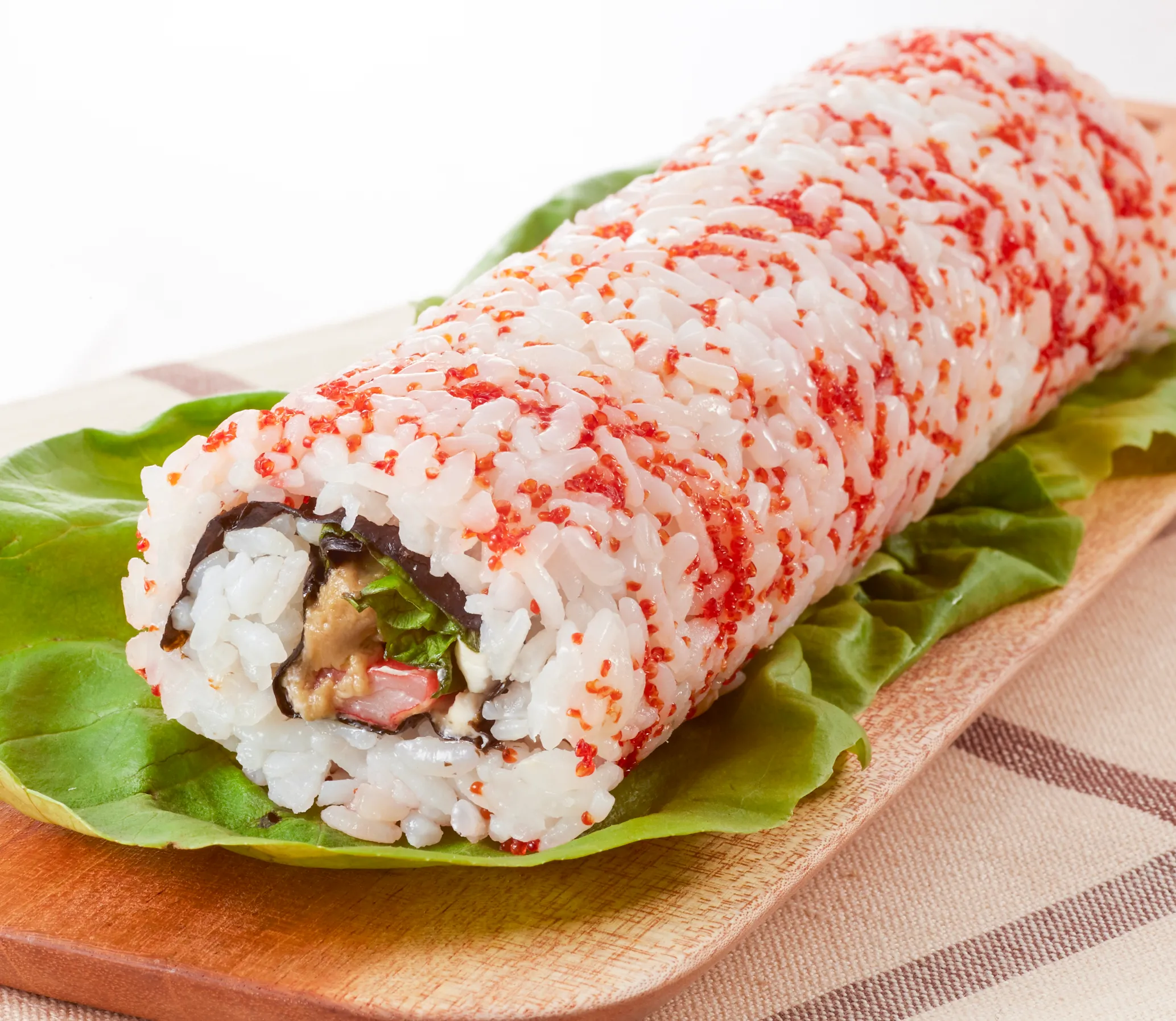アメリカのおしゃれな巻き寿司「カリフォルニアロール」を販売。表面はプチプチ食感のとびっこをまぶしています。