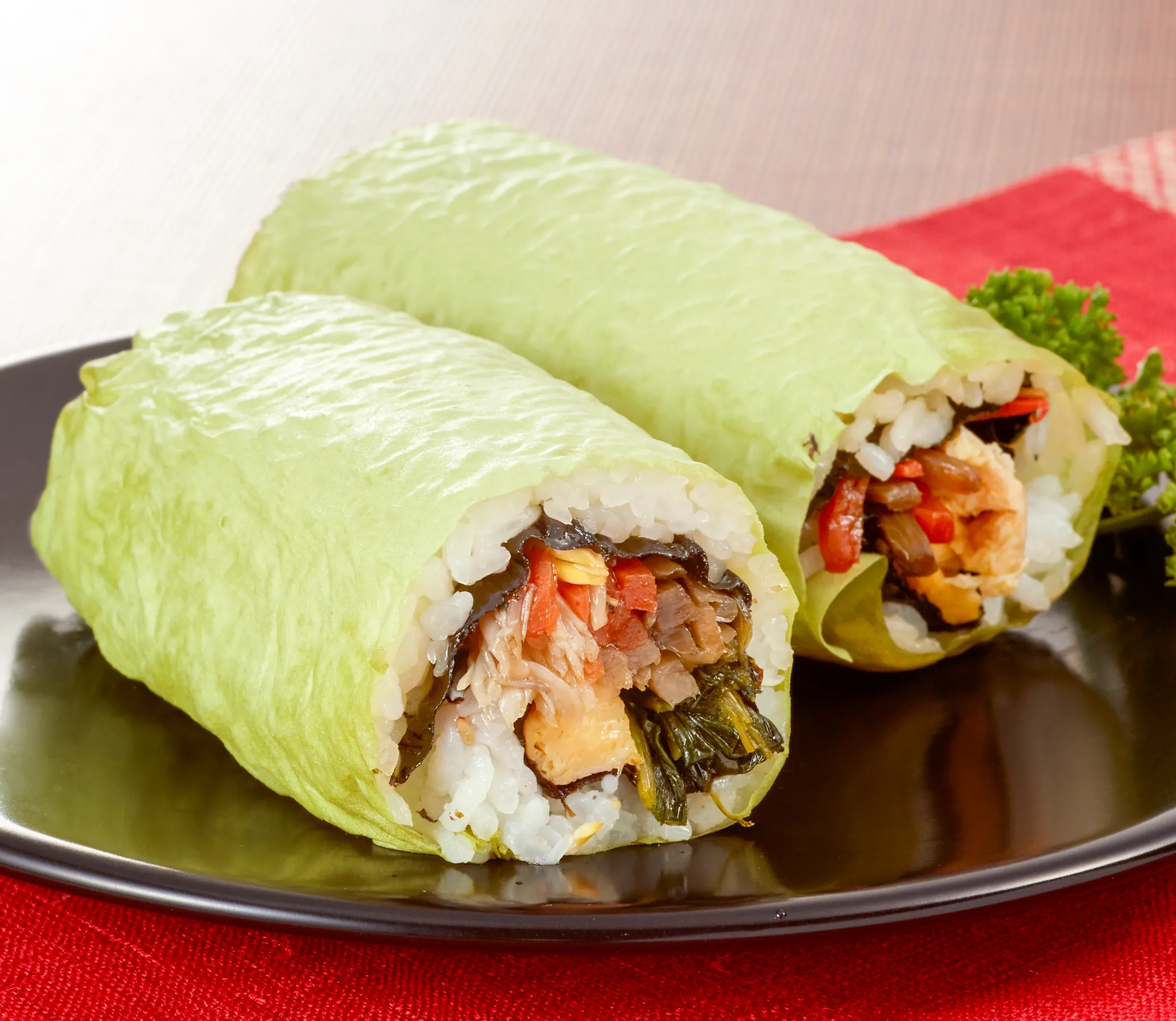 ビビンバを巻いた恵方巻きは、大豆シートで巻いており、優しい色合いの見た目も特徴。