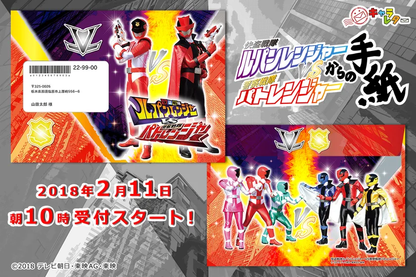 『キャラレター』( http://charaletter.com/ )では、最新スーパー戦隊から届く手紙「快盗戦隊ルパンレンジャー」「警察戦隊パトレンジャー」、2種類それぞれを同時に発売します。受付は2018年2月11日(日)の初回放送終了後、午前10時より開始。『スーパー戦隊からの手紙シリーズ』のW新作はキャラレターも史上初の試み、どちらのスーパー戦隊ヒーローが人気を集めるのか注目です!!