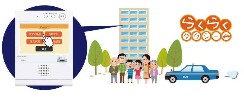本年にサービスを開始し、インターホンの画面ひとつですぐにタクシーを呼ぶことができる通常配車および、日時と希望台数を指定して予約する予約配車をご利用いただけます。将来的には、定額タクシーなどのサービスを拡大し、らくらくタクシーのサービスを提供している全国47都道府県のタクシー会社との連携を進め、より便利な暮らしの実現に努めてまいります。