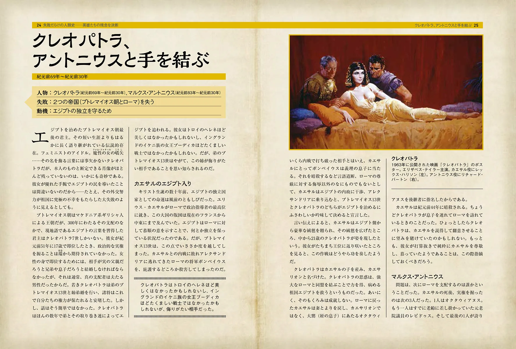 本書は、「クレオパトラ、アントニウスと手を結ぶ」「チャーチルの描いた国境線、今日まで中東戦争の火種に」など、人類が犯した愚の骨頂とも言うべき失敗を47話にまとめて収録。カラーの図版、イラスト、写真を豊富に使用し紹介しています。