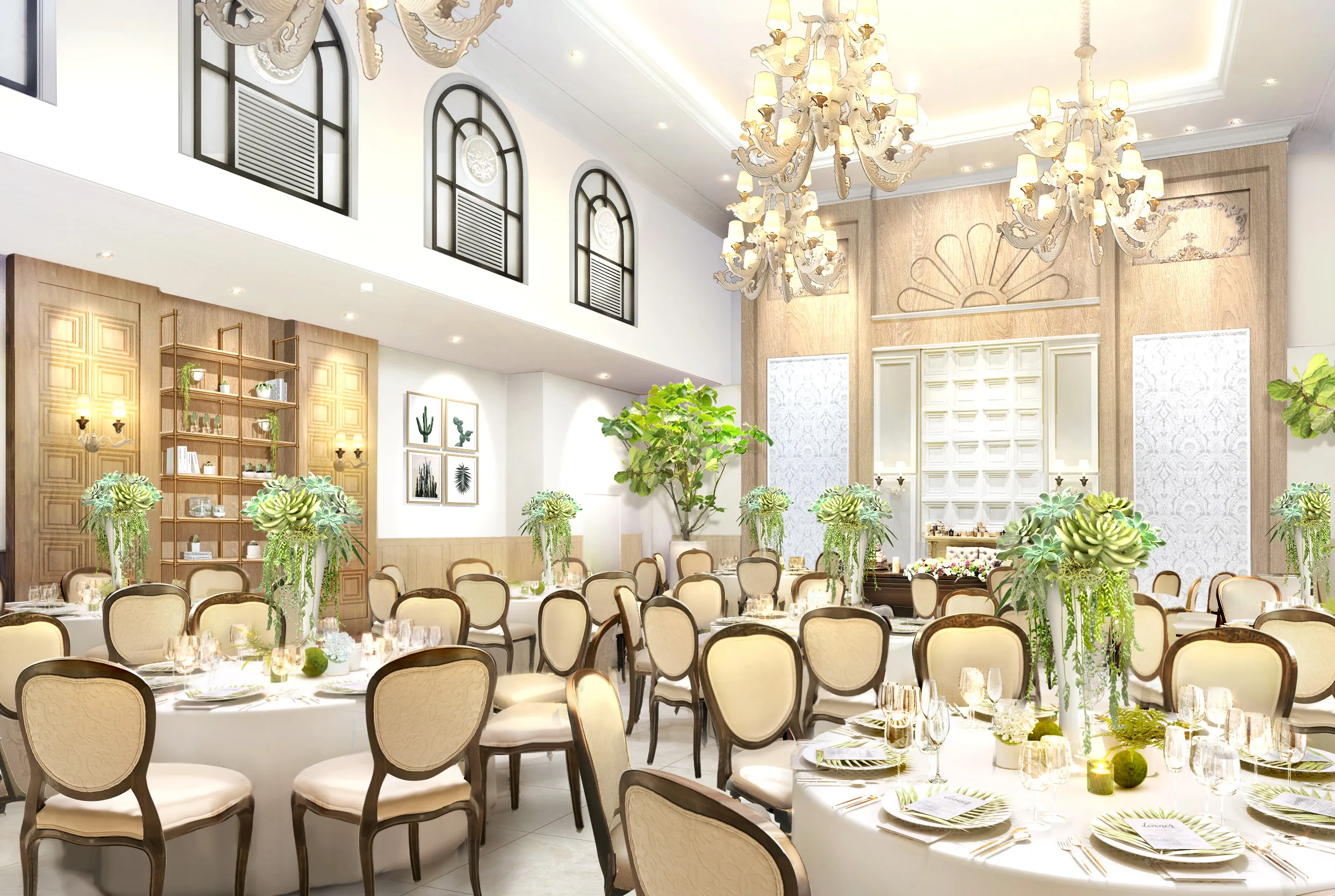 天井から吊り下げた植物をモチーフにしたグリーンのインテリアや、ペンダント照明が飾られた空間はまさに全天候型の室内オアシス。フレンチクラシックをベースに、トレンドであるグリーンインテリアの要素を加え、心地良いパーティ空間でゲストをおもてなし致します。