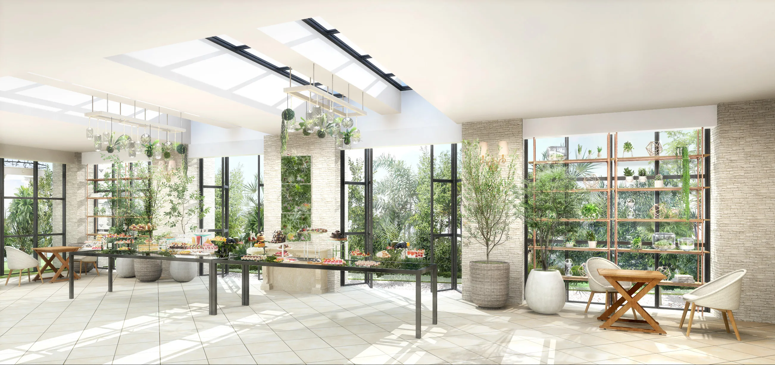 壁一面に張り巡らされたガラスから降り注ぐ光がとても明るく開放的な雰囲気の会場に、新たにグリーンの要素を取り入れることで、トレンド感と非日常感を演出し、パーティへの期待感をより一層高める空間へとリニューアルいたしました。