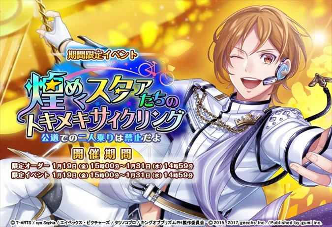 ギークス株式会社 (本社:東京都渋谷区、代表取締役社長:曽根原稔人)が、株式会社gumi(本社:東京都新宿区、代表取締役社長:國光宏尚)にライセンスを許諾した、ゲームアプリ『カクテル王子(プリンス)』(略称:カクプリ)において、1月19日(金)15時より、アプリ内イベント「煌めくスタァたちのトキメキサイクリング ~公道での二人乗りは禁止だよ~」を開催することをお知らせします。