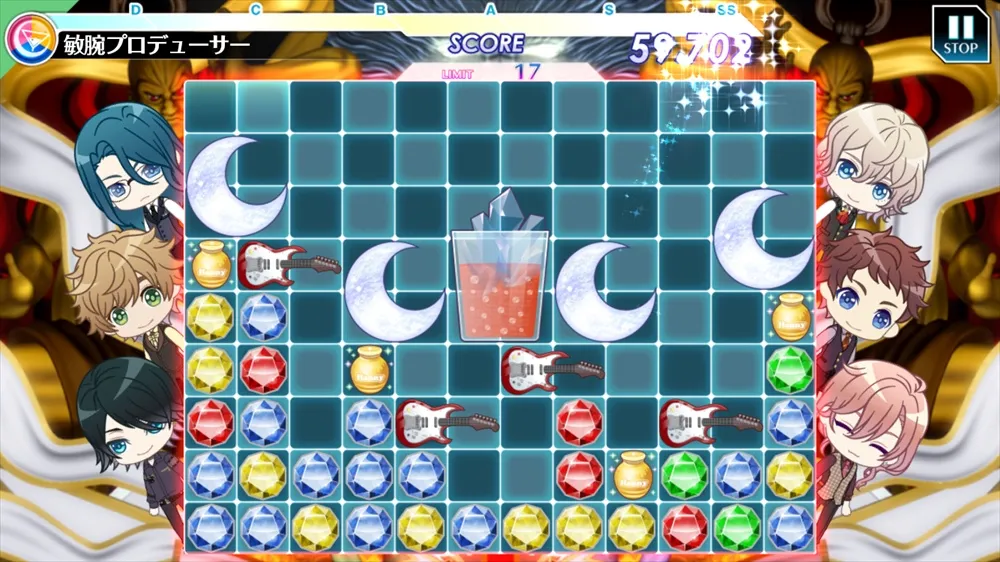 イベント接客のミニゲームは「パズルタッチ」。2個以上つながった同色のピースをタップして消し、フルーツや酒瓶を全て落とすとクリアとなります。