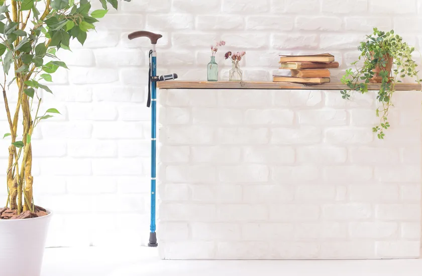スーパーなどお店のレジ前で杖の置き場に困ったら、伸ばして置くだけで安定して杖を立てかけることができます。