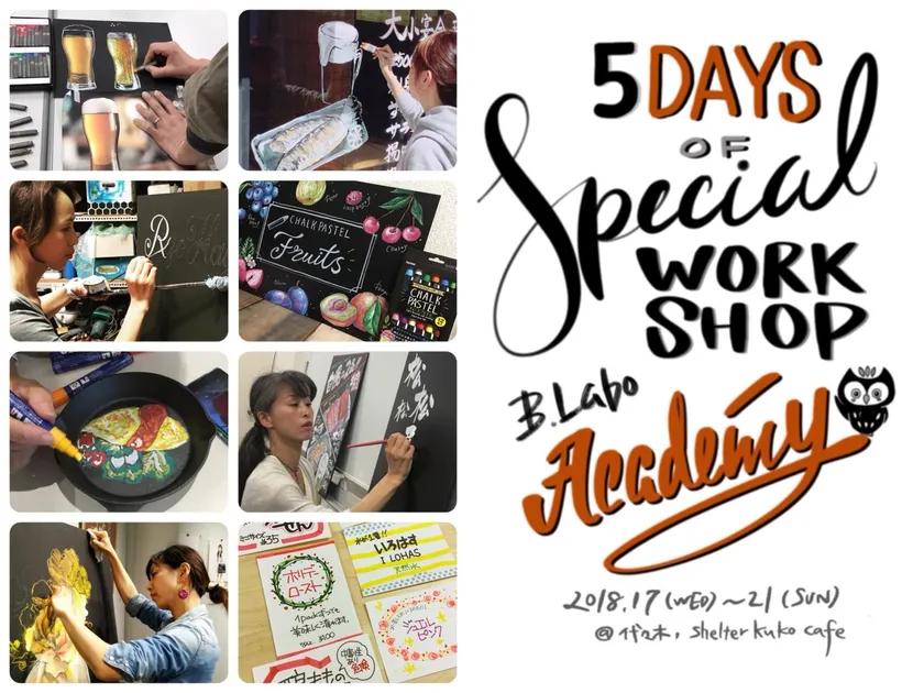 一般社団法人 日本ボードアート協会(代表理事:早坂 陵)が運営する黒板専科のb.laboは、日本の黒板文化を盛り上げボードライターという職業を確立すべく、スペシャルな講師によるワークショップを2018年1月17日(水)~21日(日)までの五日間開催いたします。