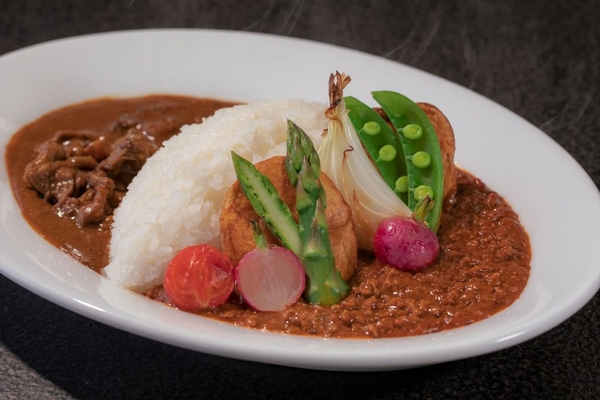 スパイスカレーと、春野菜を添えたキーマカレーの2種を味わえます。スパイスカレーには、にんじんとトマトのペーストにりんごの果汁とたっぷりの香辛料を使用しています。それらをじっくりと煮込むことで濃厚な旨みと辛さが調和した味わいに仕上げました。お湯にくぐらせて、程よく脂肪の溶け落ちた柔らかな牛しゃぶ(和牛の薄切り)をその中に混ぜ込んでいます。キーマカレーには、素材そのままの旨みを活かせるように、種類ごとに火入れの仕方を変えて調理した春野菜を添えて提供します。