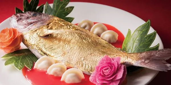 蒸した鯛の片面に薄く金箔を貼りつけました。さらに、中国では一般的に春節に食べる料理とされている水餃子を添え、春節を祝うひと品としてご用意いたしました。
