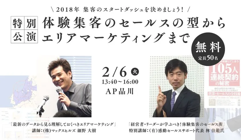 「2018年スポーツクラブ経営に役立つ集客セミナー」と題して、二部構成のセミナーを開催。第一部は、当社・細野より2015年の国勢調査などをデータを基に、エリアマーケティングの理解しておきたい点について講演いたします。第二部は、特別講師として、「105人連続契約の秘密」の著書である成約率アップのセールスコンサルタント・林 佳範氏をお招きして経営者・リーダーが学ぶべき「体験集客のセールスの型」の考え方や、今日本で最強の型と呼ばれている即日即断のセールスの型を講演いただきます。