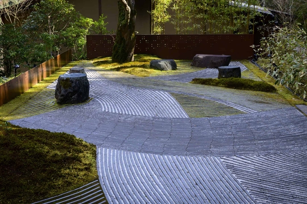 平安貴族は自身の邸宅の白砂が敷き詰められ、池泉(ちせん)に流れ込む遣水(やりみず)*3が引かれた広大な自然を彷彿させる庭で催される舞楽をはじめとする儀式を楽しんだとされています。星のや京都が位置する奥嵐山は、かつて平安貴族が別荘を構え、渓谷の四季の風景を愛でた風光明媚(ふうこうめいび)な場所です。また、奥の庭は白砂と燻し瓦で枯山水を模し、星のや京都の目の前を流れる大堰川(おおいがわ)の流れが滔々(とうとう)と続いていく様子を表現している庭です。平安貴族が舞楽に興じていた庭さながらの奥の庭で、舞楽の華やかな音色と勇壮な舞を鑑賞します。