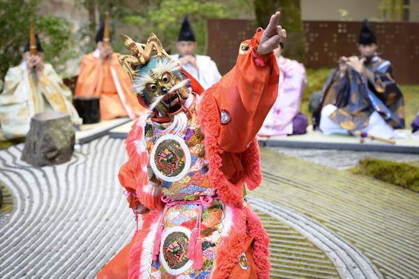 「蘭陵王」は舞楽の演目です。源氏物語「御法」では臨終間近の紫の上の供養行事の中で、蘭陵王の音色が華やかに響き渡る様子が描かれています。蘭陵王の華やぎと紫の上の生涯を重ね、その心情を際立たせていることが特徴的です。本イベントでは、白砂と燻し瓦で模した枯山水が広がる奥の庭で、華やかな舞楽の音色と勇壮な舞を鑑賞します。節目を迎える立春の時期に旧年を振り返り、活力を得て心新たに春を迎えてほしいと考えています。