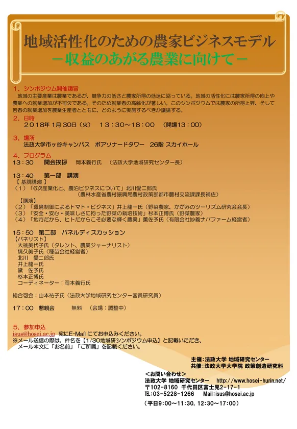 法政大学地域研究センター・大学院政策創造研究科 共催シンポジウム「地域活性化のための農家ビジネスモデル -収益のあがる農業に向けて-」1/30(火)開催