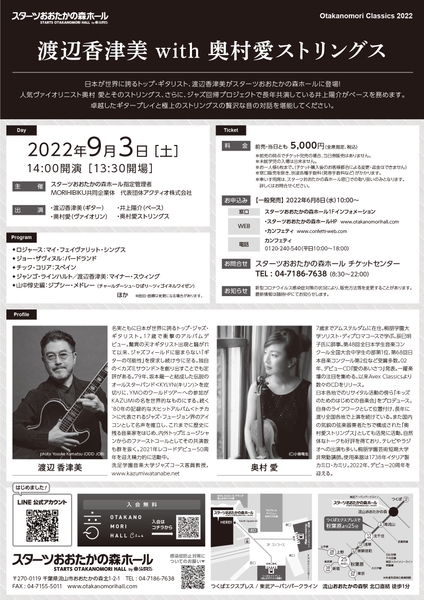 スターツおおたかの森ホール指定管理者MORIHIBIKU共同企業体 代表団体アクティオ株式会社主催、『渡辺香津美 with 奥村愛ストリングス』が2022年9月3日(土)にスターツおおたかの森ホール(千葉県流山市)にて開催されます。