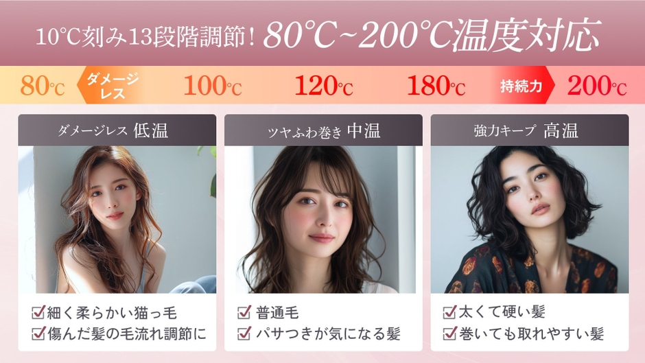 髪質やスタイルに合わせて、80℃〜200℃の13段階温度調節が可能。細く柔らかい髪から太く硬い髪まで、理想のカールを最適な温度で自在に楽しめます。また、毎日の使いやすさにもこだわり、熱くならない「掴めるグリップ」や滑り止めの「サポートシリコンライン」、ねじれを防ぐ「360°回転コード」など、細部まで快適さを追求。軽い力で扱える「押し込みやすいクリップ」設計により、ネイルをしていてもスムーズに操作でき、毎日のスタイリングをより美しく仕上げます。