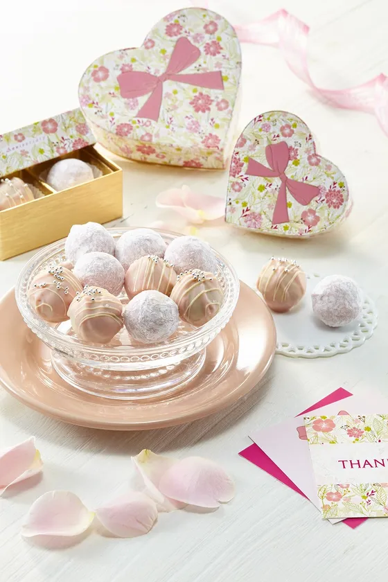 さらに辛口のシャンパンを瓶一本豪快に混ぜ合わせることで、ローズの風味とチョコレートの甘みを引き立て、気品溢れる大人の味わいに仕上げました。コーティングにはストロベリーチョコレートとシュガーパウダーを使用。