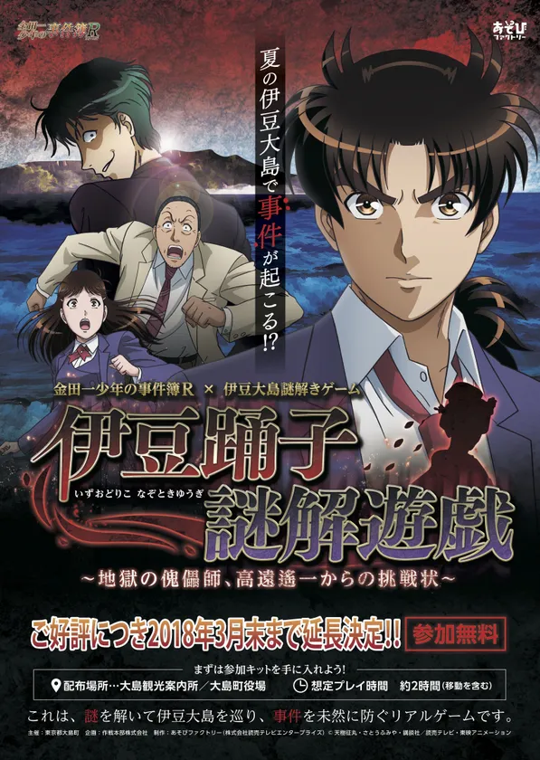 「伊豆踊子謎解遊戯~地獄の傀儡師、高遠遙一からの挑戦状~」は、アニメ「金田一少年の事件簿R」を題材とした周遊型謎解きゲームで、作戦本部株式会社(本社:東京都杉並区、以下 作戦本部)と株式会社読売テレビエンタープライズ(本社:大阪府大阪市、以下 YTE)が企画制作しています。伊豆大島を舞台に、「金田一少年の事件簿R」の世界観のなか、様々な謎や暗号、ミッションを乗り越え、事件の解決をめざします。