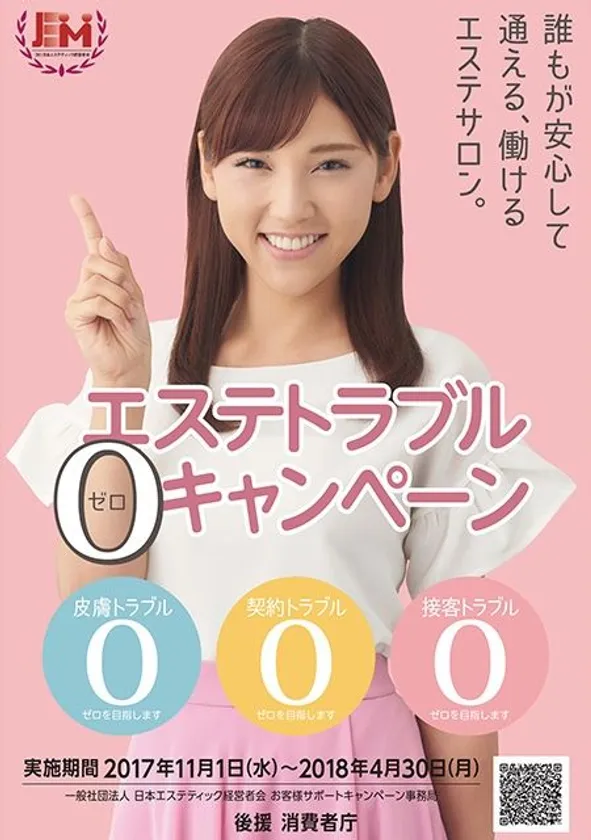 「エステトラブルゼロキャンペーン」は、消費者庁後援のもと2018年4月30日(月)まで実施される、エステサロンに通う消費者様のエステでの「トラブル0」を目指すためのキャンペーンです。