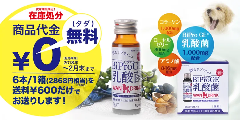 株式会社グローバルエンジニアリング(本社:愛知県名古屋市、代表取締役社長:荒川 健一)は、独自の「BiProGE(R)乳酸菌」をベースにした、獣医師監修の愛犬用エナジードリンク『ワンドリンク』を、商品代金0円、送料600円のみでご購入いただける大変お得なキャンペーンを開始いたしました。賞味期限間近のため、2月末まで在庫に限っての特価キャンペーンです。