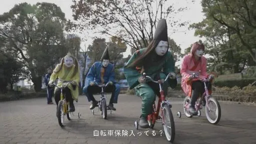無表情で補助輪付自転車を漕ぐ平成KIZOKUの4人。その激走ぶりにマラソンをしている通行人も思わず振り返ってしまいます。平成30年4月1日から自転車保険が義務化される告知が入り,動画は終了します。