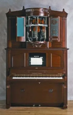 自動演奏バイオリン「フォノリスト・ヴィオリーナ」は、1910年頃にドイツのフッフェルト社によって作られ、ピアノの伴奏と共に3挺のバイオリンを使って自動で演奏する楽器です。当館所蔵の当該楽器は1993年にジークフリート・ヴェンデル(ドイツ、ジークフリート自動演奏楽器博物館、館長)によって仕組みや演奏方法などは勿論、内部の部品や素材にまでこだわって、ほぼ当時のままに復元されました。自動演奏楽器の中でも、最も人々を驚かせたものの1つで、全世界で推定60台が遺っているとされます。しかし、その大多数が演奏できる状態ではないと推測され、復元品も10数台しか作られていない大変貴重なものです。