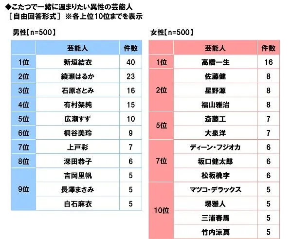 まず、「こたつで一緒に温まりたい」と思う異性の芸能人について聞いたところ、男性回答(500名)では、2017年もドラマやCMで大活躍だった「新垣結衣さん」が1位となり、2位「綾瀬はるかさん」、3位「石原さとみさん」が続き、「吉岡里帆さん」と「白石麻衣さん」もトップ10入りしました。