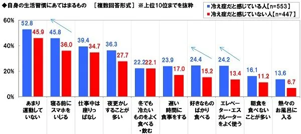 冷え症だと感じている人(553名)と感じていない人(447名)を比較すると、「エレベーター・エスカレーターをよく使う」(冷え症24.2%、冷え症でない13.4%、10.8ポイント差)や「寝る前にスマホをいじる」(冷え症45.8%、冷え症でない36.0%、9.8ポイント差)、「好きなものばかり食べる」(冷え症24.4%、冷え症でない15.2%、9.2ポイント差)では、冷え症だと感じている人のほうが10ポイント前後高くなりました。冷えには様々な原因がありますが、運動不足や食生活の乱れ、自律神経の乱れも冷えの原因といわれています。運動不足につながる“エレベーター・エスカレーターを頻繁に使うこと”、食生活の乱れにつながる“好きなものばかり食べること”、自律神経の乱れにつながる“寝る前のスマホ使用”などの生活習慣は、“冷え症さん”のほうがあてはまる割合が高いことが明らかになりました。
