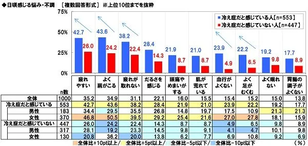 ◆“冷え症さん”ほど疲れや不調を感じている!冷えOLの半数が「肩こり」に悩む