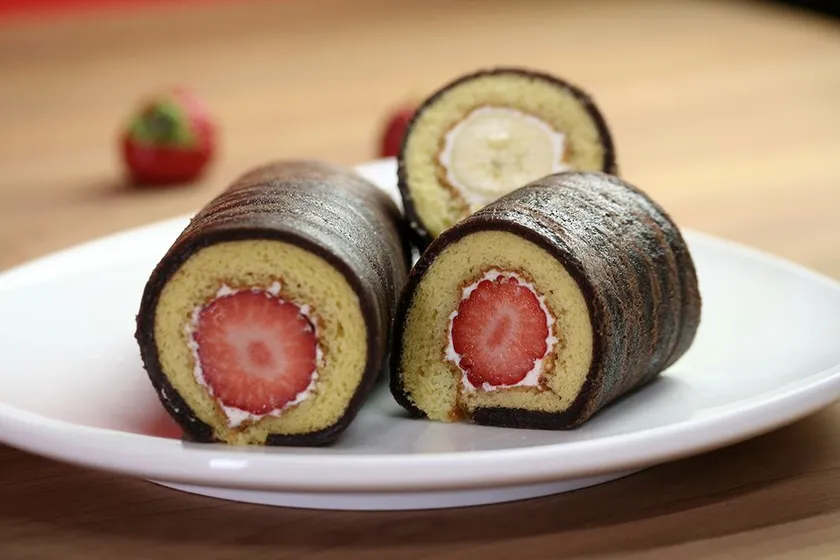 今回1番苦労した点は、餅とスポンジ生地の融合です。通常の、餅を伸ばしその上にスポンジ生地を生クリームなどで張り付ける作り方の場合、生地同士がはがれやすく食感の一体感が薄くなるため、今回は鉄板に餅生地を流し、さらにスポンジ生地を流し一緒に焼成することで、つなぎクリームのない一体感のある特製スポンジが完成いたしました。また、表面には、鬼のパンツの様な虎柄もつけることにも成功しました。中には、お子様に人気のフルーツ苺とバナナを大きめにカットしたものを巻上げています。