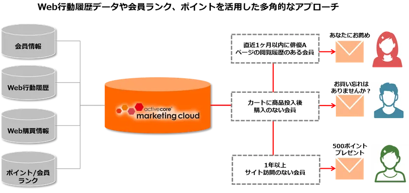 (※1)activecore marketing cloud:企業内の基幹データやWeb行動ログ、外部データといったマーケティングデータを収集・蓄積・統合・抽出し、AI/機械学習も利用した顧客軸でのデータ分析からレコメンド・マーケティングオートメーションまでが一つにつながったクラウドベースの統合型ソリューション。