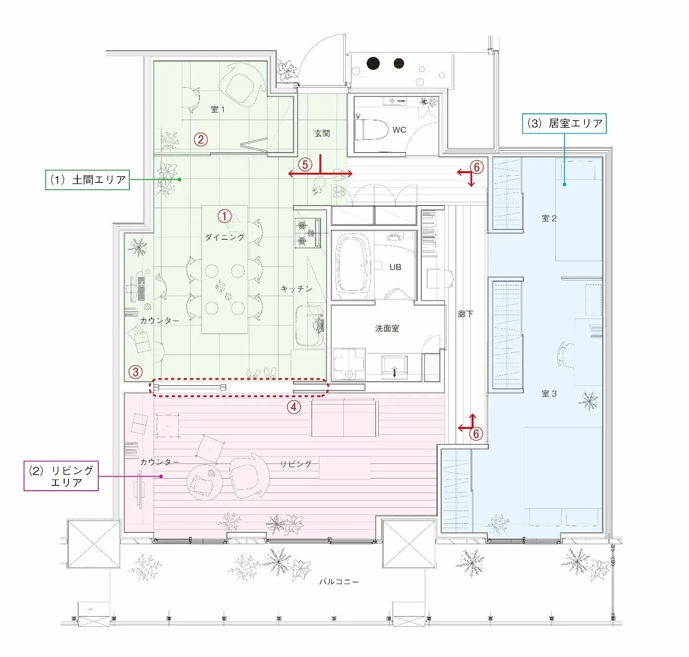 バルコニーに面し、明るいリビングエリアは、土間エリアから一段高く設計することで意識の切り替え(上記図の4)が生まれ、家族と過ごすリラックススペースとして使用できます。土間エリアとは引き戸でつながっているので、くつろぎながら仕事につながる調べ物をしたり、アイディアを思いついたらカウンターでメモを取ったりすることもできます。